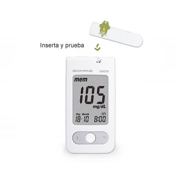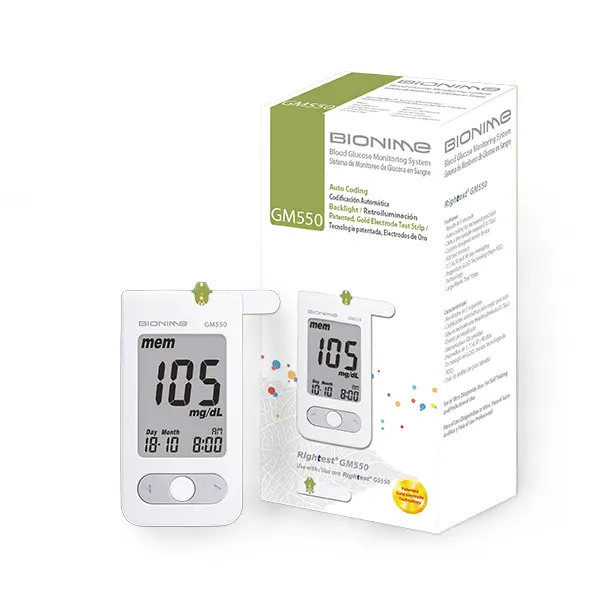Glucómetro Bionime GM550 con biosensores de oro y codificación automática. Resultados en <5 s, cumple norma ISO 15197:2013. Ideal para uso clínico o institucional.